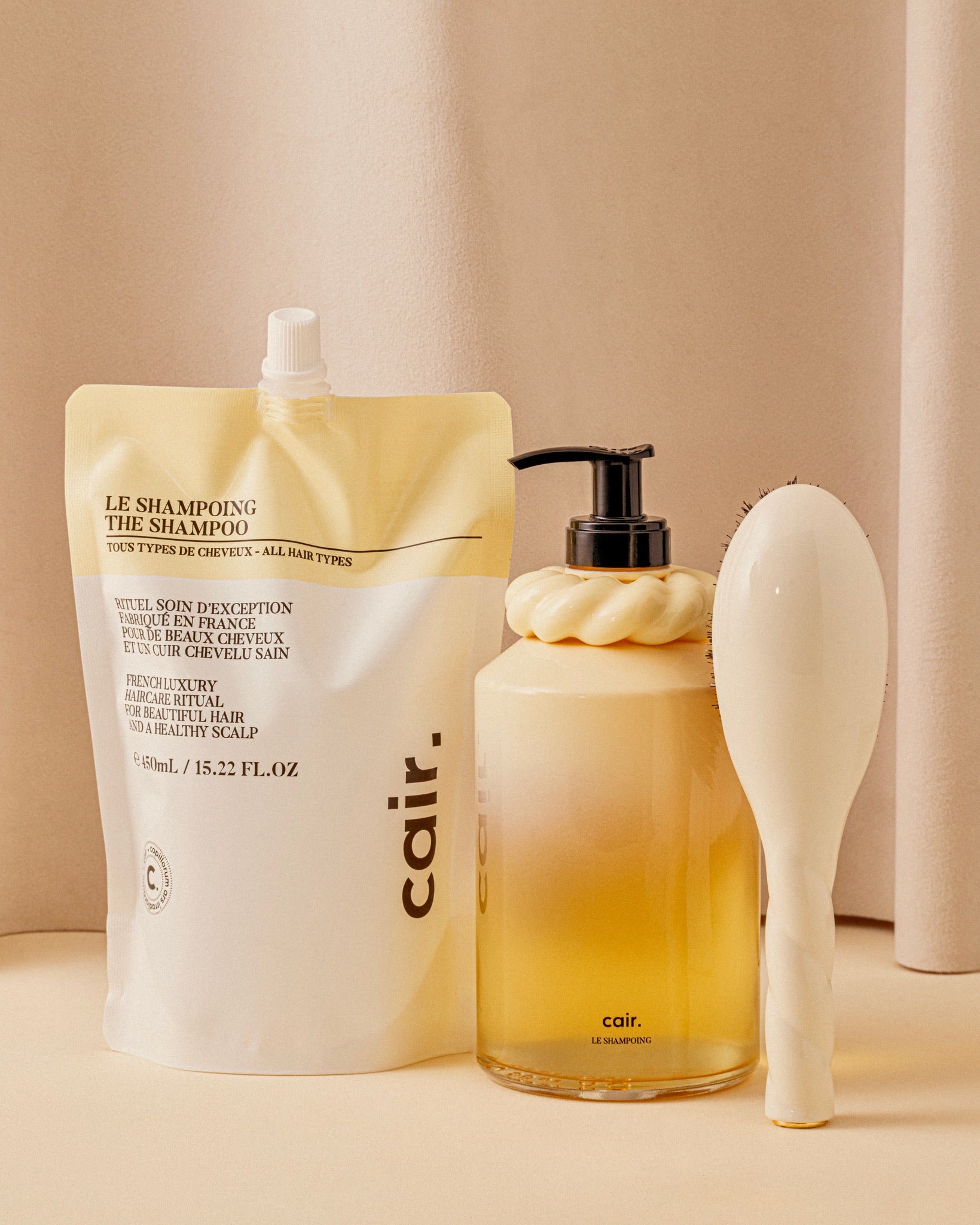 Découvrez le Duo Sublime, réunissant la Petite Brosse N.04 Blanc Crème, le Shampoing Cair et sa recharge offerte. Un rituel de soin capillaire complet pour nettoyer, masser et revitaliser la chevelure en douceur.